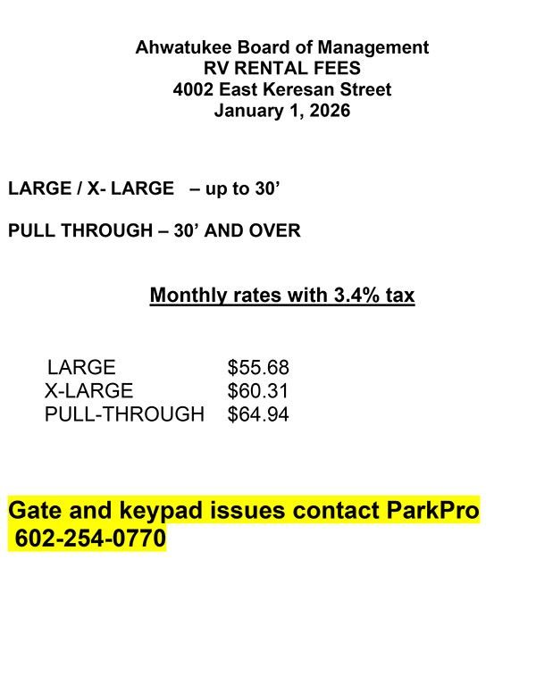 The ABM owns and operates a 200 space RV storage park. Conveniently located in Ahwatukee, we offer storage for your recreational vehicle at an affordable cost. Our gated parks include a dump station as well as paved roadways. RV rental spots are currently only available to ABM residents. Rentals are based on availability with a minimum 6-month lease required. Please call 480-893-3431 ext. 5 for availability.